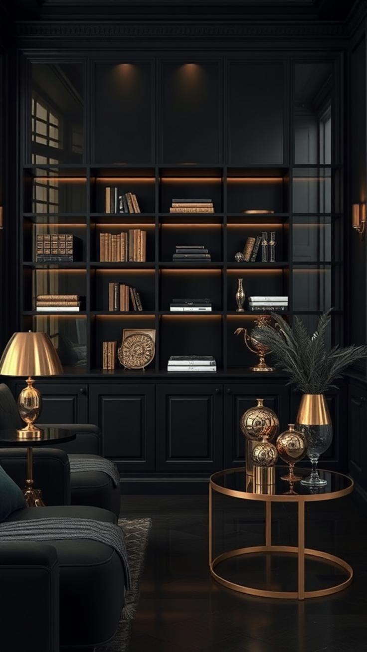 - Einrichtungsidee 2: Charcoal Black Wand mit goldenen Bilderrahmen und eleganter Standlampe