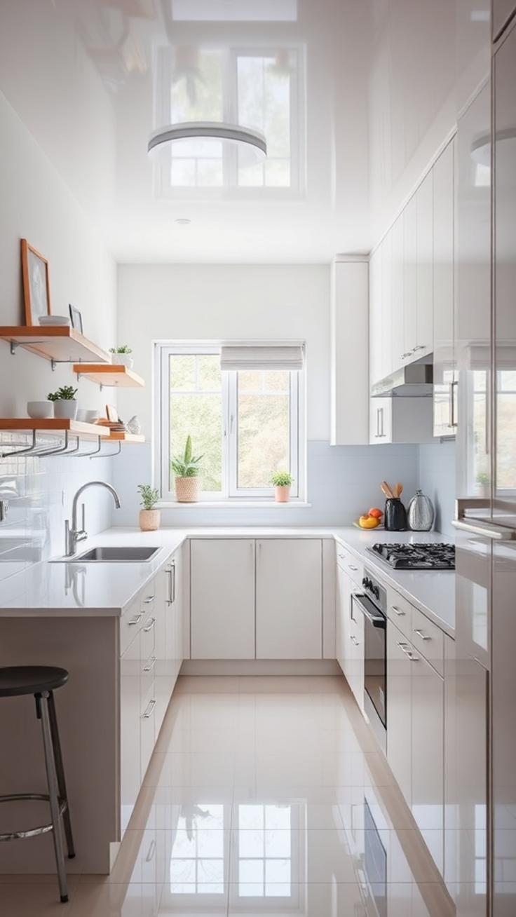 Eine durchdachte Beleuchtung spielt ebenfalls eine wichtige Rolle: Indirektes Licht unter den Hängeschränken, eine helle Deckenbeleuchtung und gegebenenfalls LED-Stripes an Arbeitsflächen schaffen wunderbar lebendige und großzügige Raumverhältnisse. Spiegel oder glossy Oberflächen können zusätzlich Licht reflektieren und den Raum optisch vergrößern.