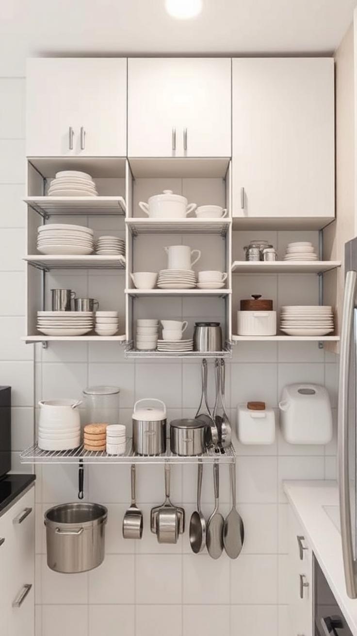 - Regale mit eingehängten Haken für Küchenhelfer