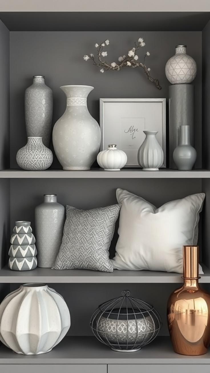 Wählen Sie Accessoires in zurückhaltenden Materialien, wie rauem Stein, matt lackiertem Metall oder Leder. Pflanzen in schlichten grauen Übertöpfen sorgen für einen natürlichen Farbkick, der das Grau lebendig macht und Frische vermittelt. Kunstobjekte in Schwarz-Weiß oder gedämpften Farben ergänzen die monochrome Farbpalette perfekt.