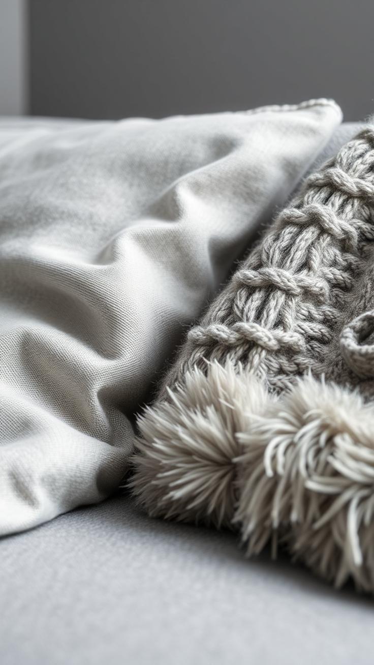 Ein grauer Teppich mit einer fühlbaren Struktur kann dem Wohnzimmer Wärme verleihen, während glatte, kühle Fliesen Ruhe ausstrahlen und Eleganz vermitteln. Ebenfalls beliebt sind gestrickte oder gewobene Textilien im Wohnzimmer oder Schlafzimmer, die für Gemütlichkeit sorgen, ohne den monochromen Look zu unterbrechen.