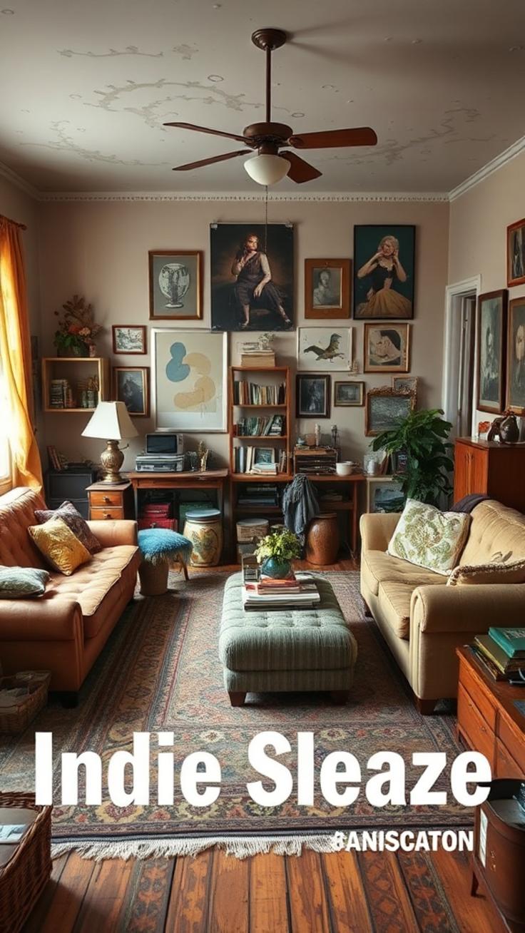 Die Raumgestaltung im Indie Sleaze Interior folgt keinem starren Regelwerk – wichtig ist vor allem Freiheit und Individualität. Möbel sollten locker arrangiert und intuitiv platziert werden, sodass verschiedene Sitzbereiche, Leseecken und kreative Nischen entstehen. Ein gemütliches Sofa mit wilden Kissen, ein bunter Teppich und eine Mischung aus Tischen und Hockern laden zum Verweilen und Experimentieren ein.