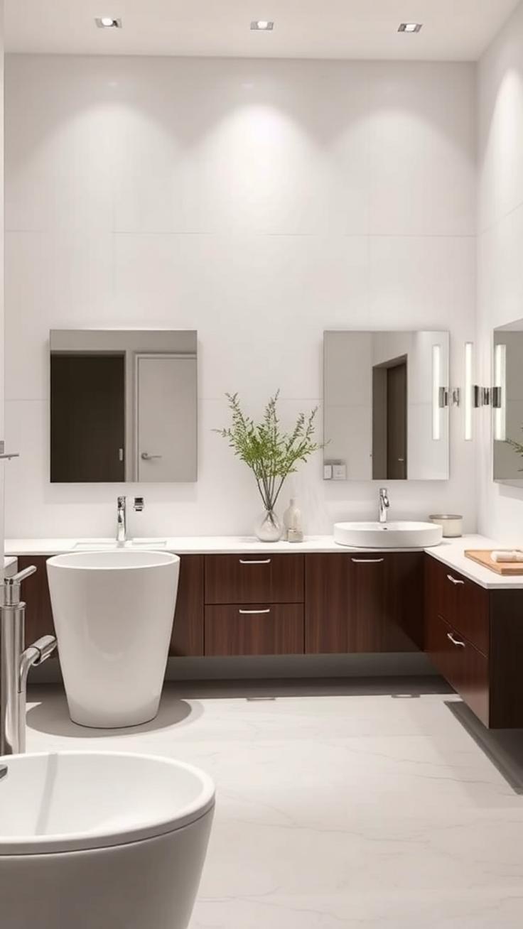 Hochglanzlackierte Oberflächen oder matte Fronten aus edlem Holz schaffen eine elegante Optik, während versteckte Griffe und Soft-Close-Funktionalitäten den hohen Komfort betonen. Spiegel mit integriertem Stauraum oder Beleuchtung ergänzen das Ensemble perfekt.