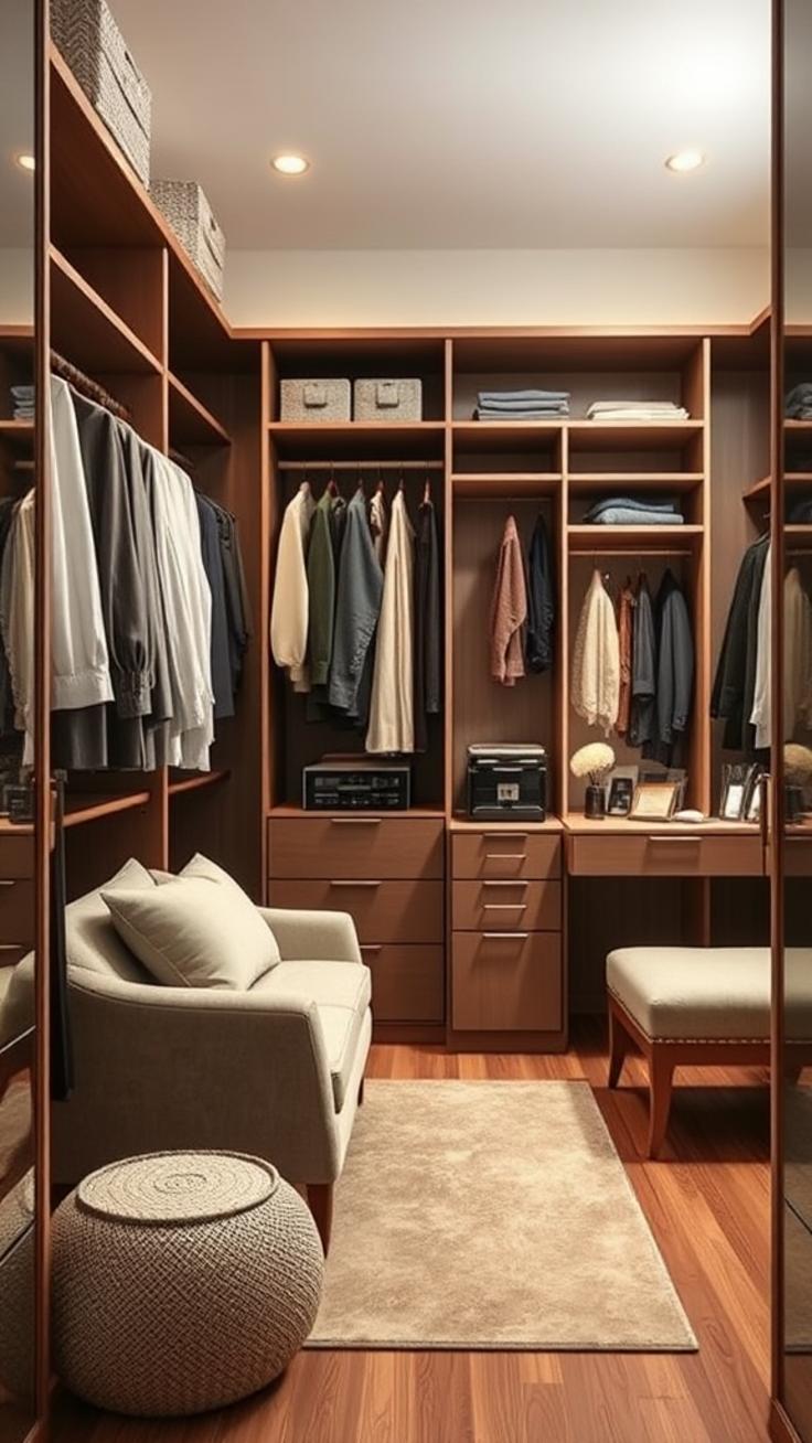 Ein begehbarer Kleiderschrank kann mehr als nur Stauraum bieten: Sitz- und Schminkbereiche verwandeln ihn in eine multifunktionale Wohlfühloase. Ein komfortabler Sitzplatz ist beispielsweise ideal, um Schuhe anzuziehen oder kurze Pausen einzulegen.